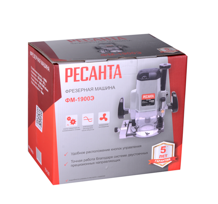 Фрезерная машина (фрезер) предназначена для выпиливания канавок, кромок, профилей и удлинённых отверстий в дереве, пластмассе и лёгких строительных материалах, а также для копировальной фрезеровки. Данный инструмент не предназначен для промышленного использования.Фрезерная машина ФМ-1900Э Ресанта используется для фигурной обработки древесины на заданную глубину. Представленная машина является самой мощной в данной серии. Боковые прорезиненные рукоятки обеспечивают надёжный захват инструмента и снижение вибрации во время работы. Специальная шкала позволяет устанавливать необходимую глубину обработки заготовки. Прочная подошва с надёжными фиксаторами. Инструмент можно настроить под конкретную задачу путём изменения числа оборотов.Особенности: