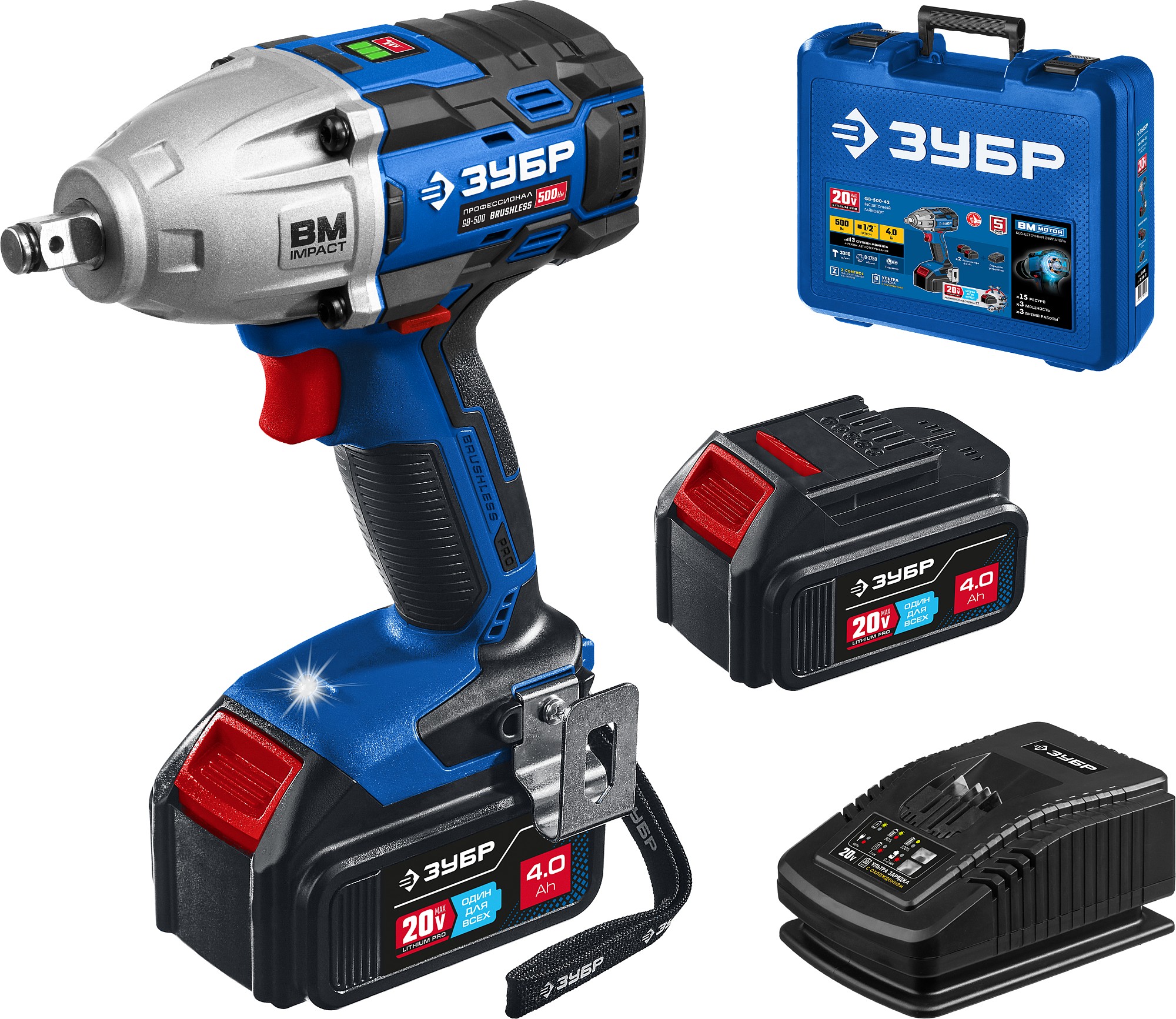 ЗУБР Т7, 20 В, 500 Н·м, 2 АКБ (4 А·ч), бесщеточный гайковерт, кейс, Профессионал (GB-500-42)