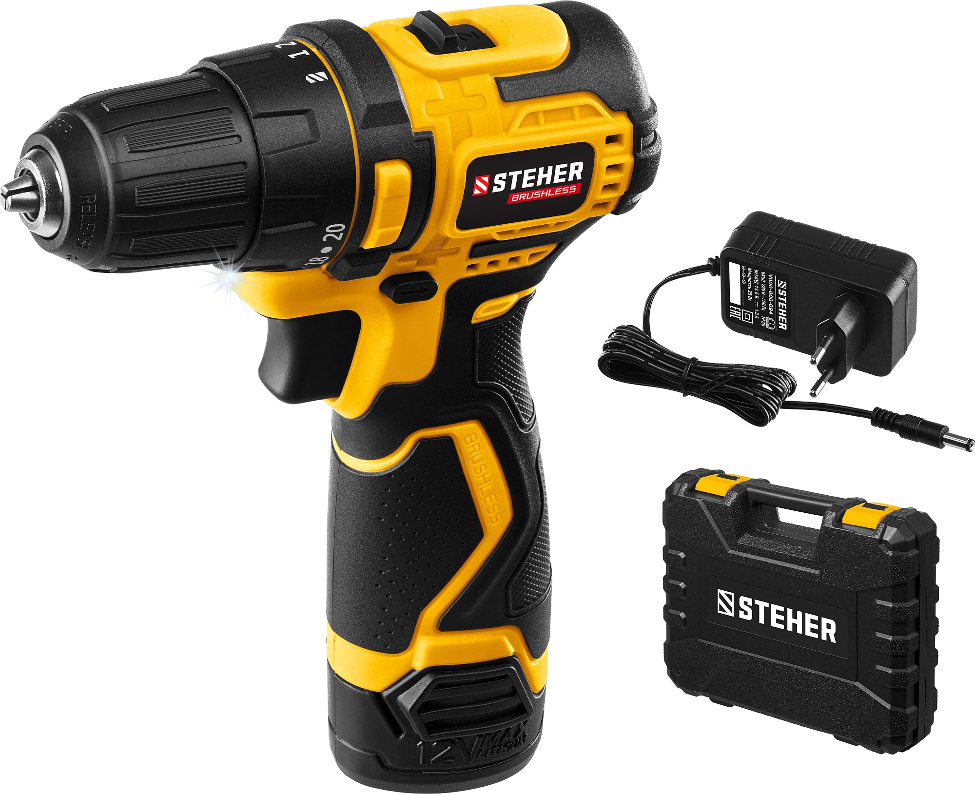 STEHER 12 В, 35 Н·м, 1 АКБ (2 А·ч), бесщеточная дрель-шуруповерт, кейс (CDB-120-1)