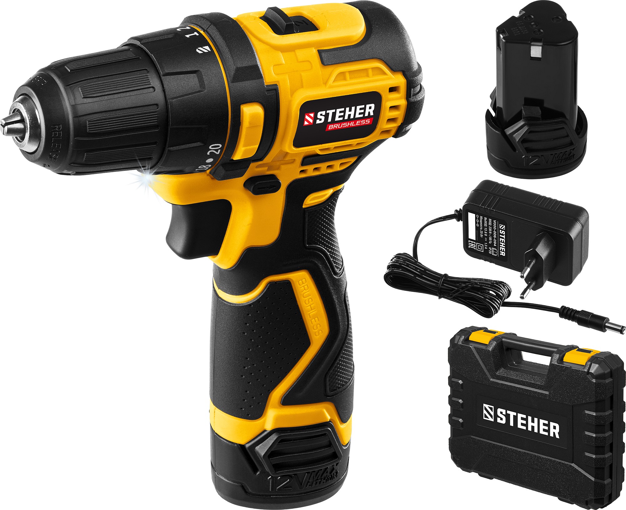 STEHER 12 В, 35 Н·м, 2 АКБ (2 А·ч), бесщеточная дрель-шуруповерт, кейс (CDB-120-2)