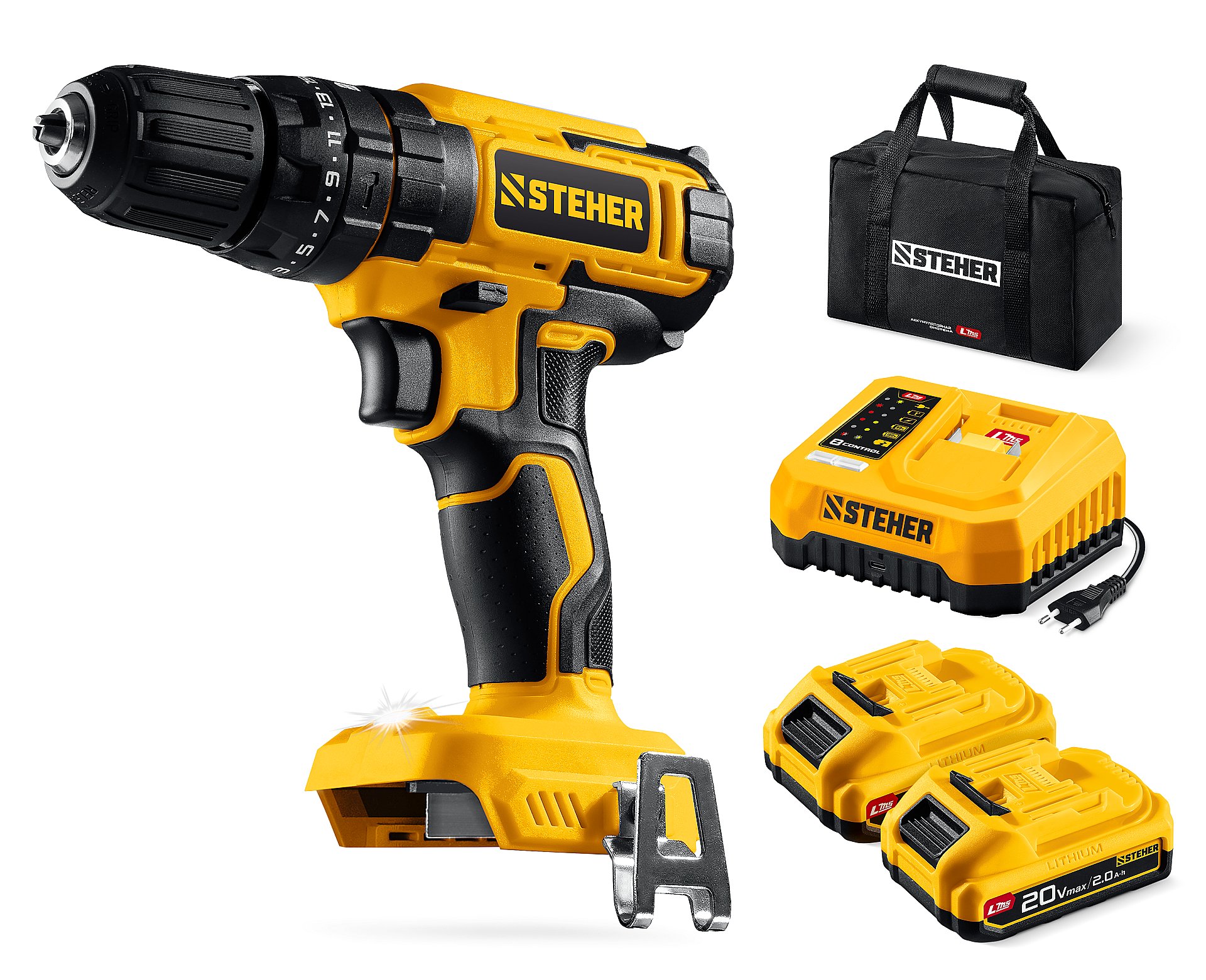 STEHER 20 В, 45 Н·м, 2 АКБ LMS (2 А·ч), бесщеточная ударная дрель-шуруповерт, сумка (CBS-45-22)