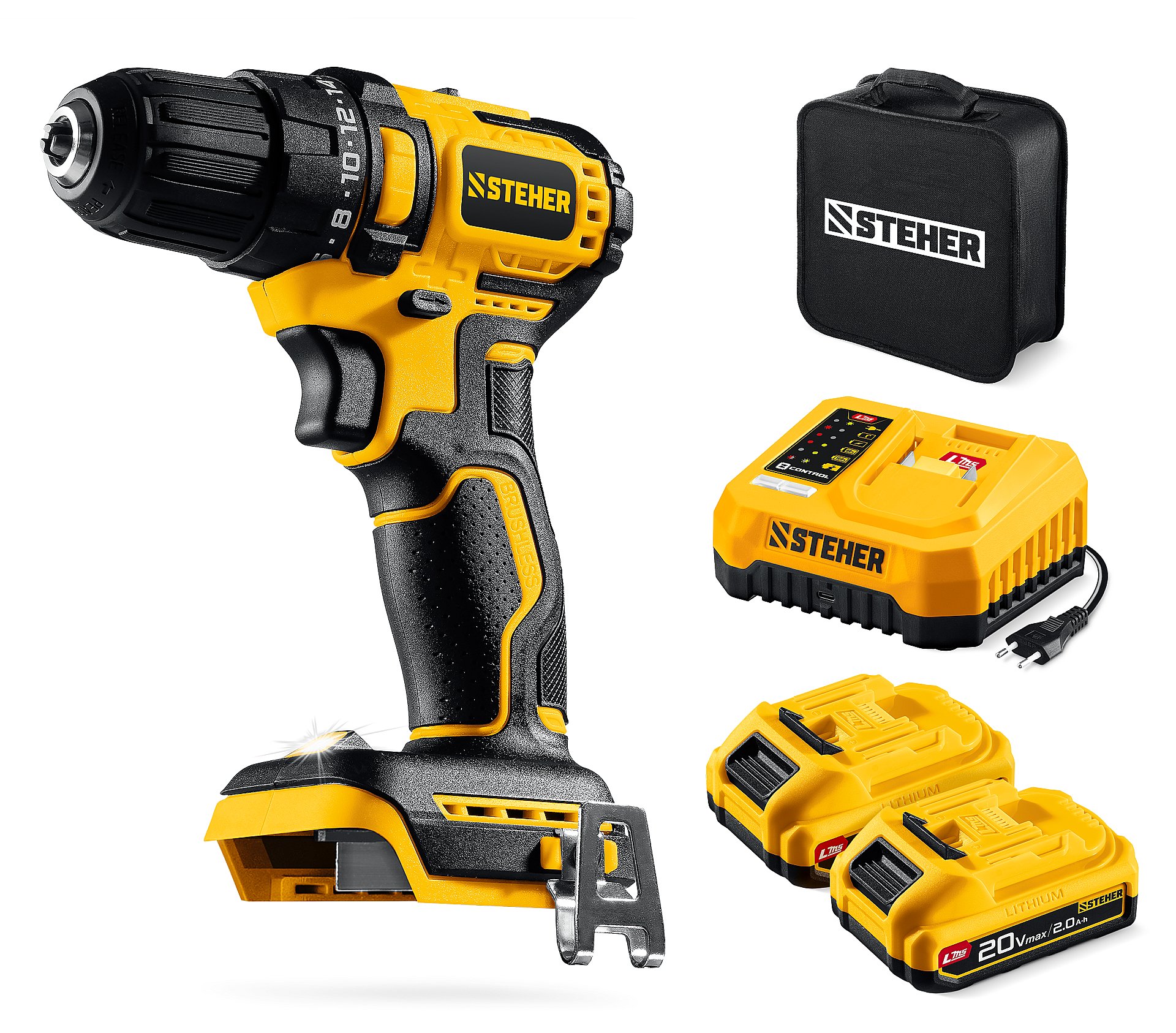 STEHER 20 В, 45 Н·м, 2 АКБ LMS (2 А·ч), бесщеточная ударная дрель-шуруповерт, сумка (CBS-45-22)