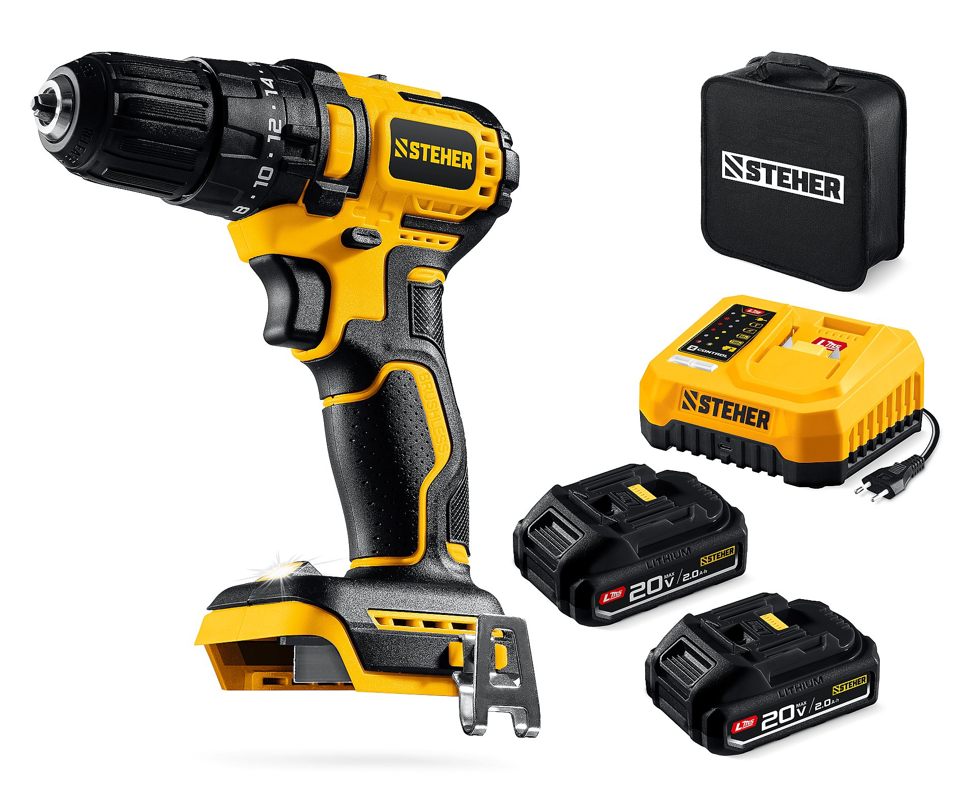 STEHER 20 В, 45 Н·м, 2 АКБ LMS (2 А·ч), бесщеточная ударная дрель-шуруповерт, сумка (CBS-45-22)
