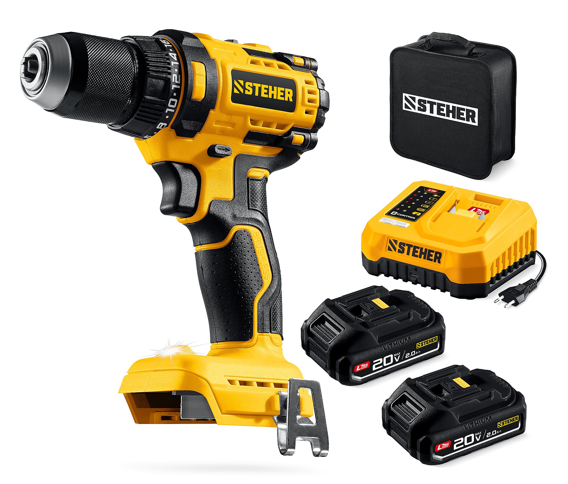 STEHER 20 В, 45 Н·м, 2 АКБ LMS (2 А·ч), бесщеточная ударная дрель-шуруповерт, сумка (CBS-45-22)