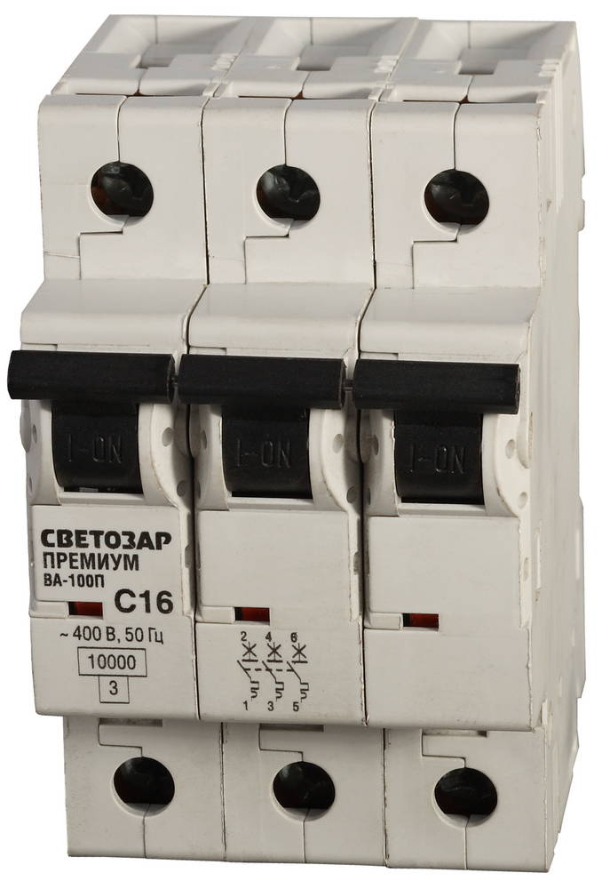 Автоматический 3-полюсный выключатель СВЕТОЗАР "ПРЕМИУМ" "C", 10 кА, 400 В имеет удобный рычажок включения/выключения.