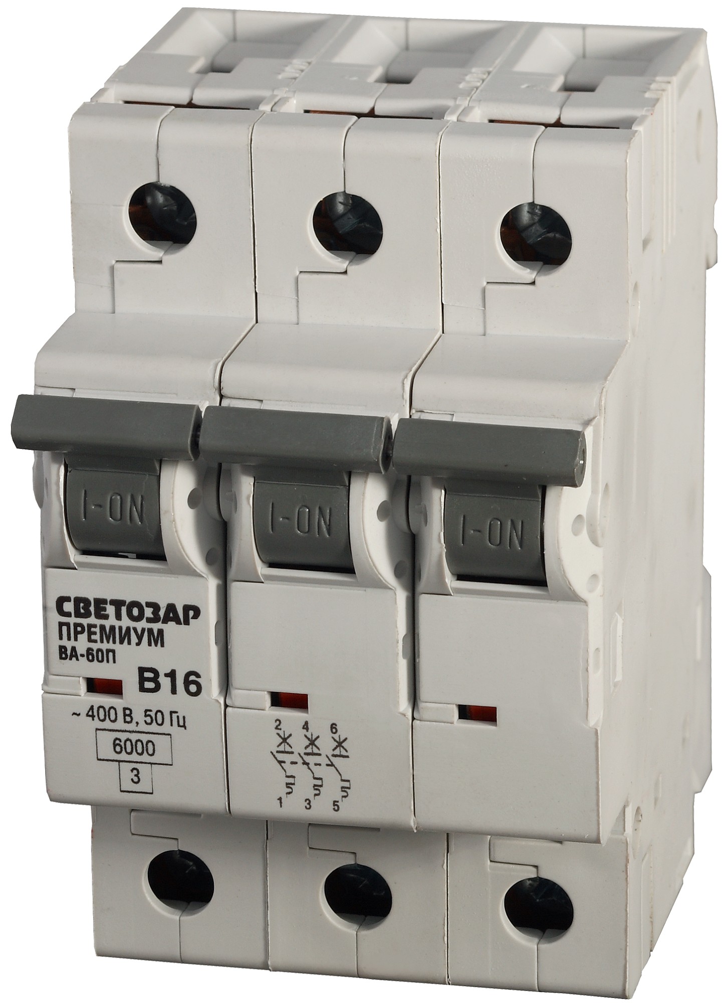Автоматический 3-полюсный выключатель СВЕТОЗАР "ПРЕМИУМ" "B", 6 кА, 400 В имеет удобный рычажок включения/выключения.