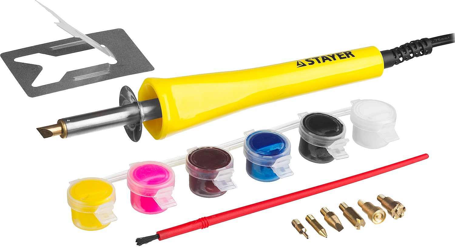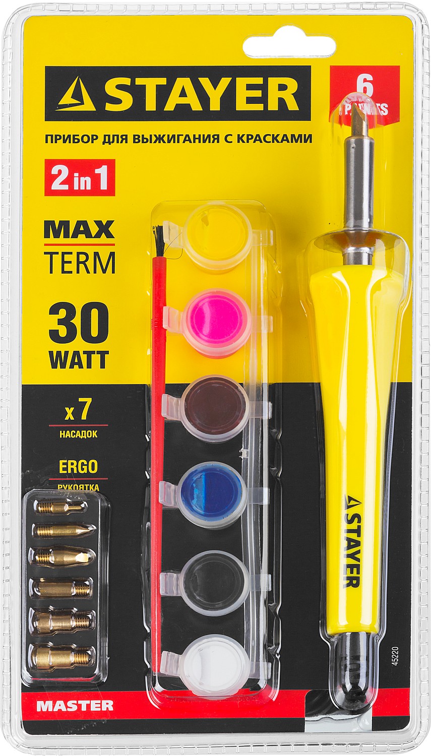 Прибор для выжигания с набором насадок 7 шт. и красками STAYER 45220 используется для декоративных работ, художественного оформления деревянных заготовок. Комплектуется семью насадками, а также красками с кисточкой. Меняя насадки, можно получить различные эффекты выжигания.