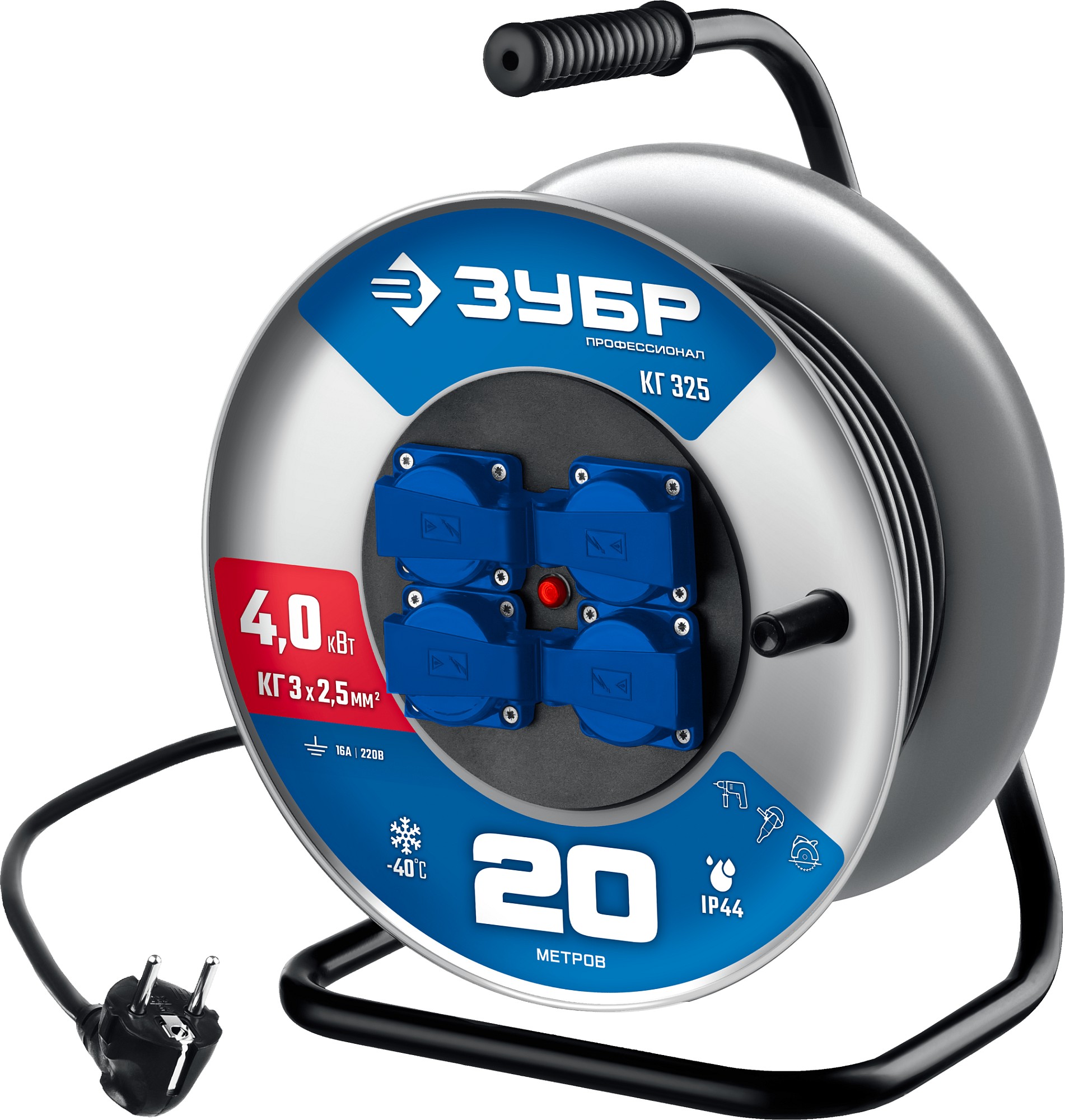 ЗУБР КГ-325, КГ, 3 x 2.5 мм2, 20 м, 4000 Вт, IP44, силовой удлинитель на стальной катушке, Профессионал (55079-20)