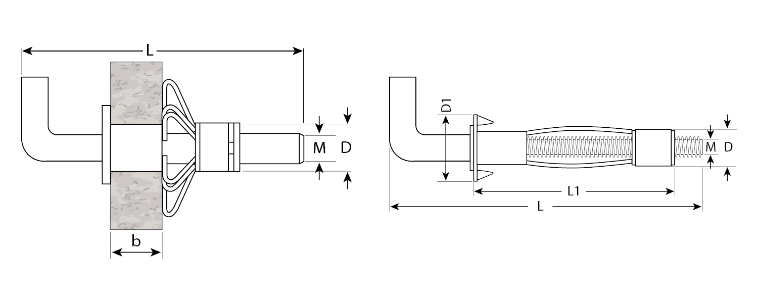 Анкер устанавливается в предварительно просверленное отверстие. При закручивании резьбового стержня с крюком происходит раскрытие сегментов анкера в виде зонта, благодаря чему происходит фиксирование анкера и увеличивается площадь контакта в пустотелом материале;