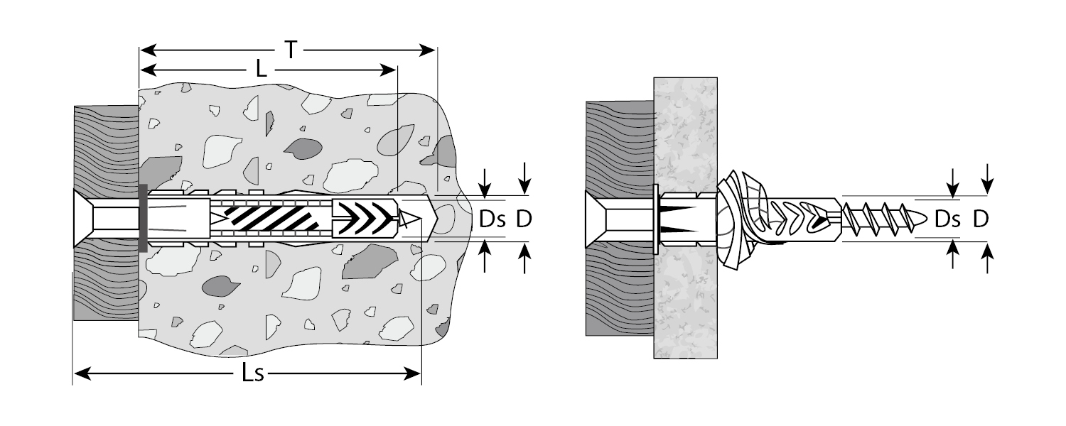 Применяются в полнотелых и пустотелых строительных материалах (бетон, кирпич, природный камень, тонкие стены, блоки и т.п.). Крепление элементов конструкций осуществляется при помощи шурупов (входят в комплект поставки). Диаметр предварительного сверления: 6 мм;