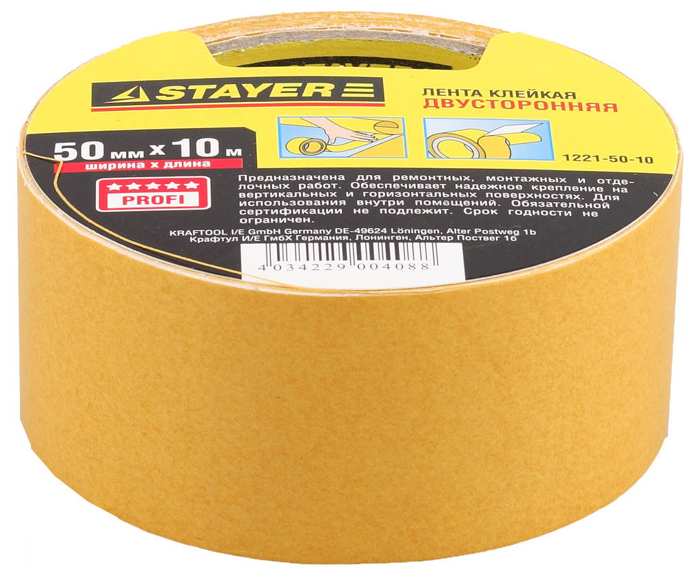 STAYER 50 мм, 10 м, на полипропиленовой основе, двухсторонняя клейкая лента (1221-50-10)