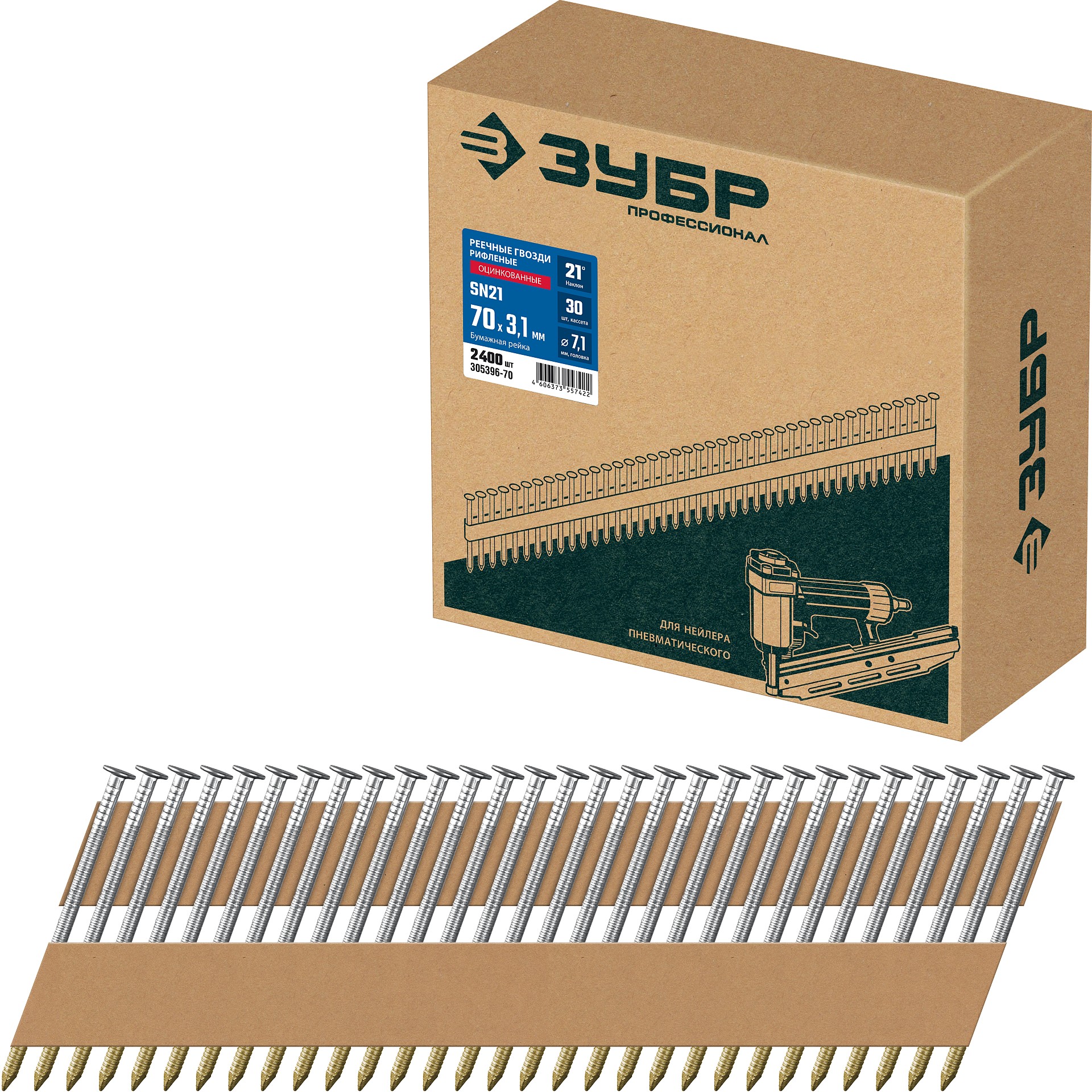 ЗУБР SN21 70 х 3.1 мм, реечные гвозди рифленые оцинкованные, 2400 шт (305396-70)