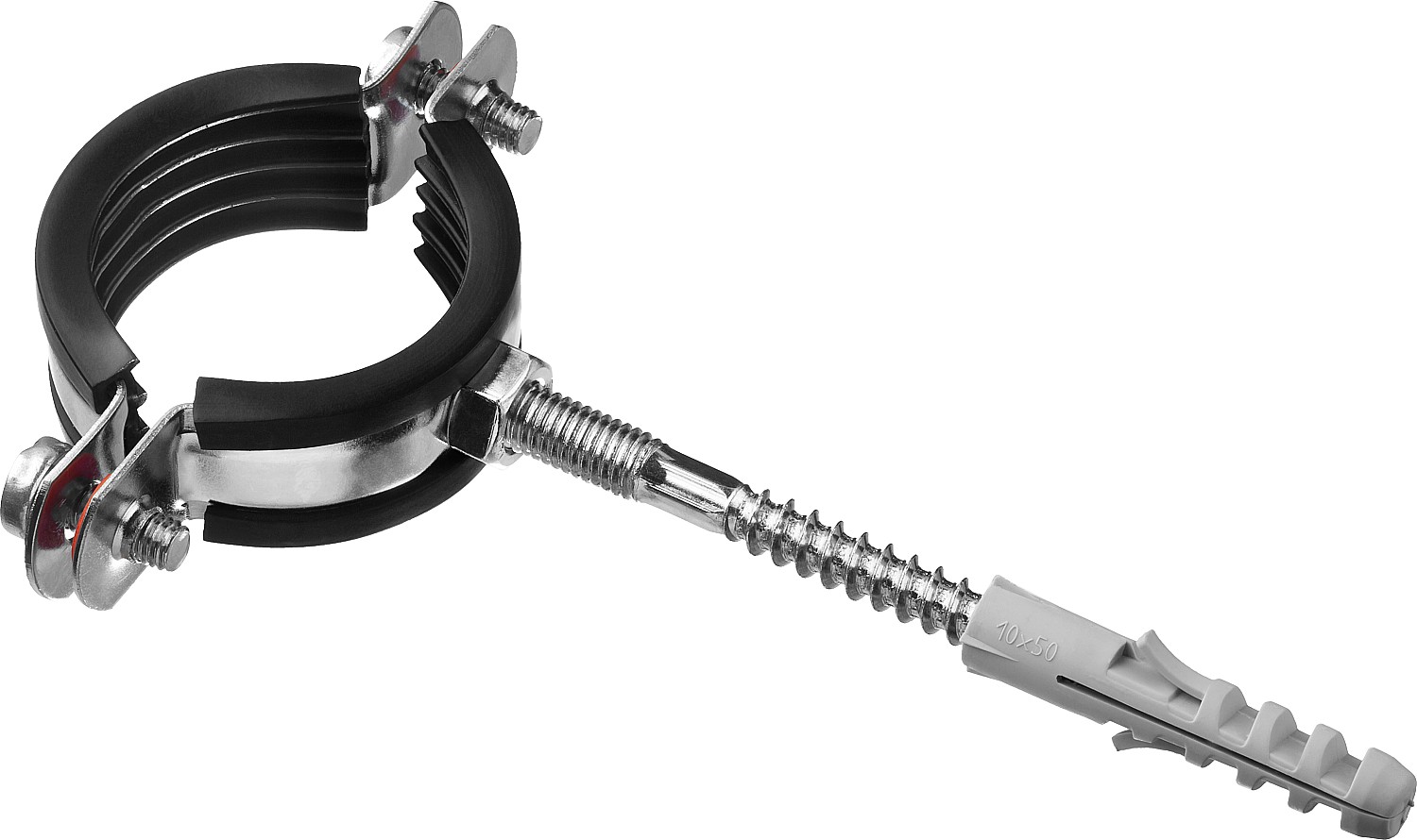-Комплектность набора позволяет крепить хомут как с помощью гайки, так и с использованием шпильки и дюбеля;