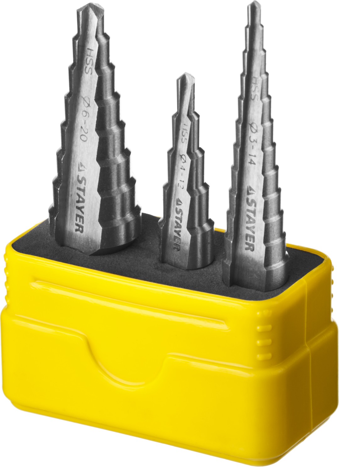 -Сверла входящие в набор, d 3-14мм, 12 ступ.(3,4,5,6,7,8,9,10,11,12,13,14мм), d 4-12мм, 5 ступ.(4,6,8,10,12мм), d 6-20мм, 8 ступ.(6,8,10,12,14,16,18,20мм)., 3 шт;