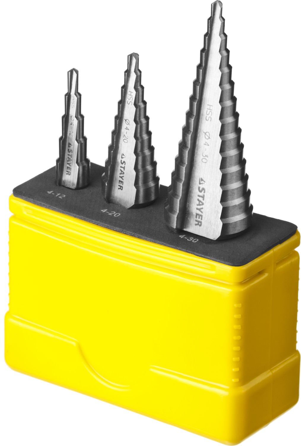 -Сверла входящие в набор, d 4-12мм, 5 ступ.(4,6,8,10,12мм), d 4-20мм 9 ступ.(4,6,8,10,12,14,16,18,20мм), d 4-30мм, 14 ступ. (4,6,8,10,12,14,16,18,20,22,24,26,28,30мм), 3 шт;