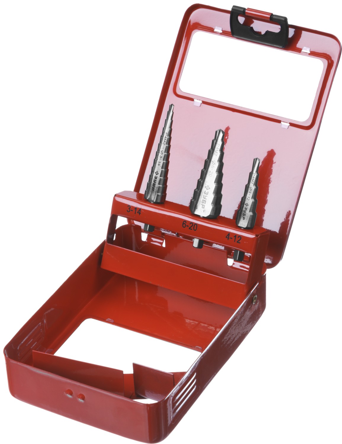 -Сверла входящие в набор, d 3-14мм, 12 ступ.(3,4,5,6,7,8,9,10,11,12,13,14мм), d 4-12мм, 5 ступ.(4,6,8,10,12мм), d 6-20мм, 8 ступ.(6,8,10,12,14,16,18,20мм)., 3 шт;
