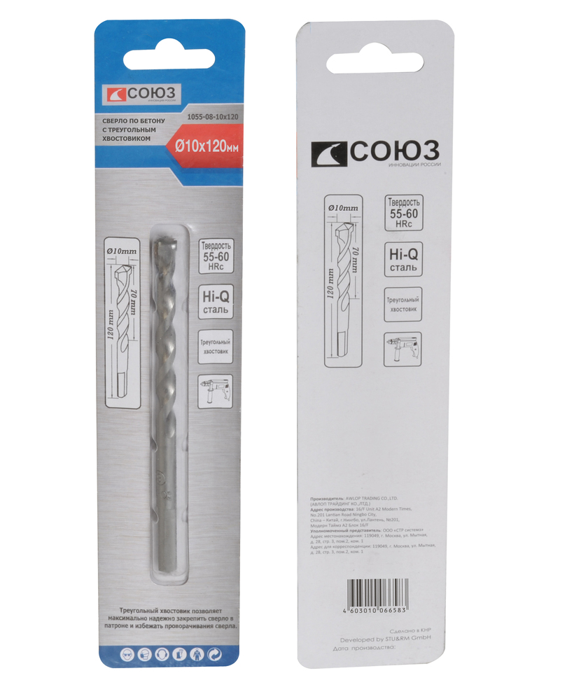 Сверло по бетону, 10x120, твердосплавная напайка BK8, треугольный хвостовик, Союз