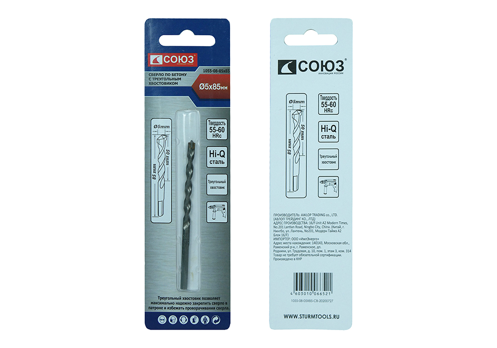Сверло по бетону, 5x85 , твердосплавная напайка BK8, треугольный хвостовик, Союз