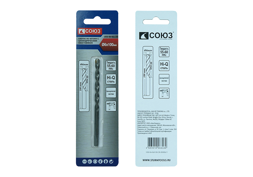 Сверло по бетону, 6x100мм, твердосплавная напайка BK8, цилиндрический хвостовик, Союз