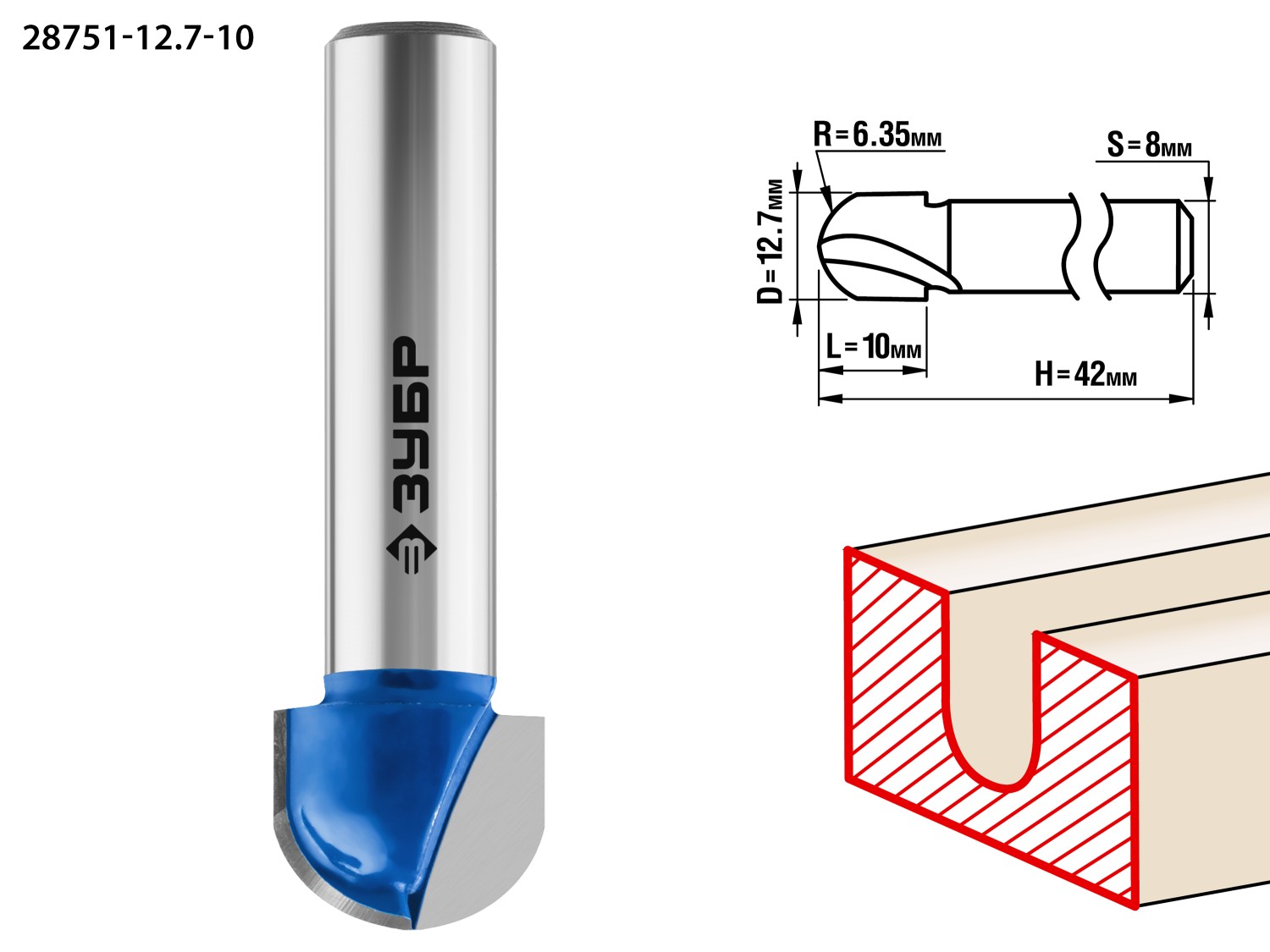ЗУБР 12.7 x 10 мм, радиус 6.35 мм, фреза пазовая галтельная, Профессионал (28751-12.7-10)