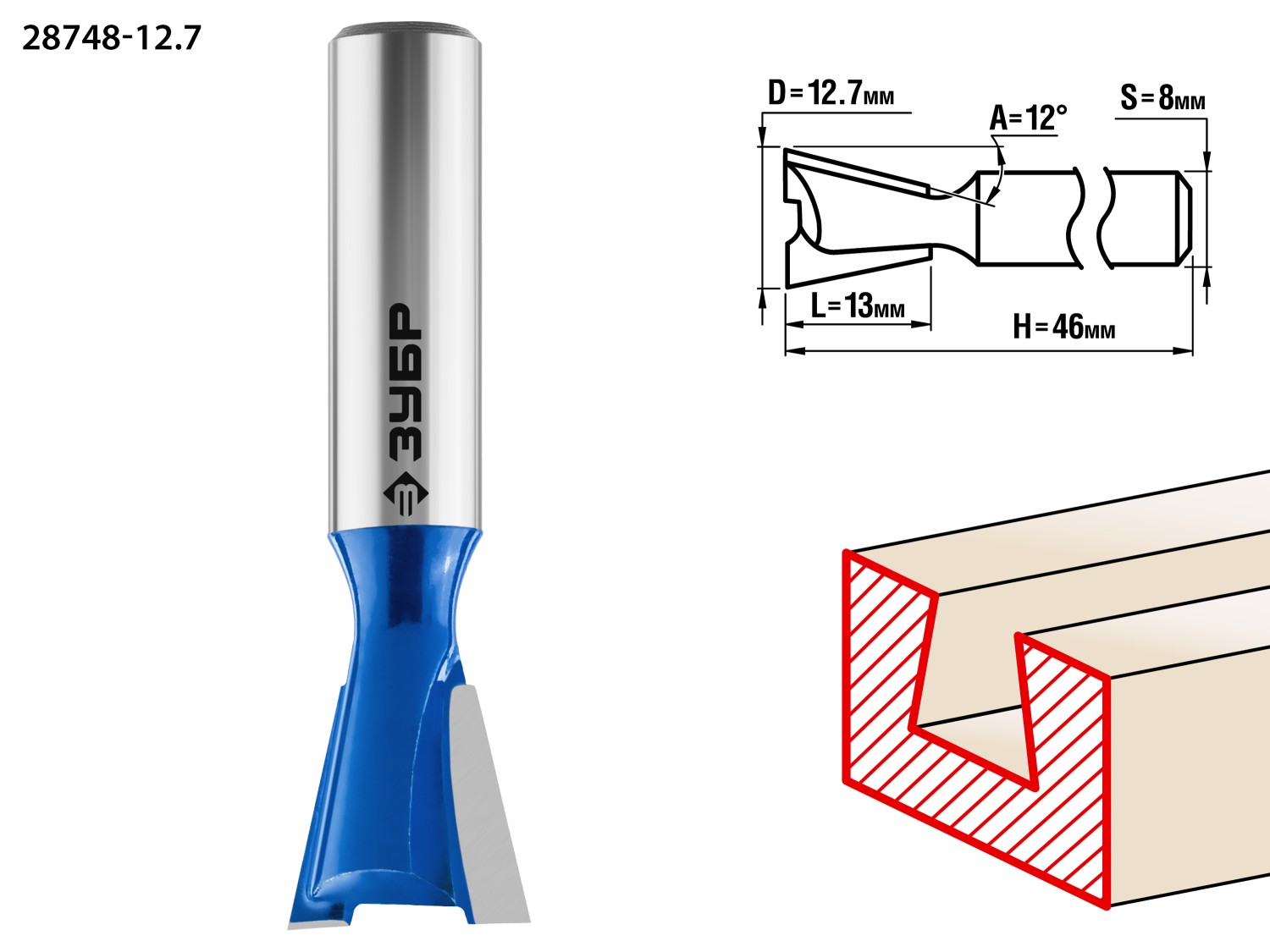 ЗУБР 12.7 x 13 мм, угол 12°, фреза пазовая фасонная ″Ласточкин Хвост″, Профессионал (28748-12.7)