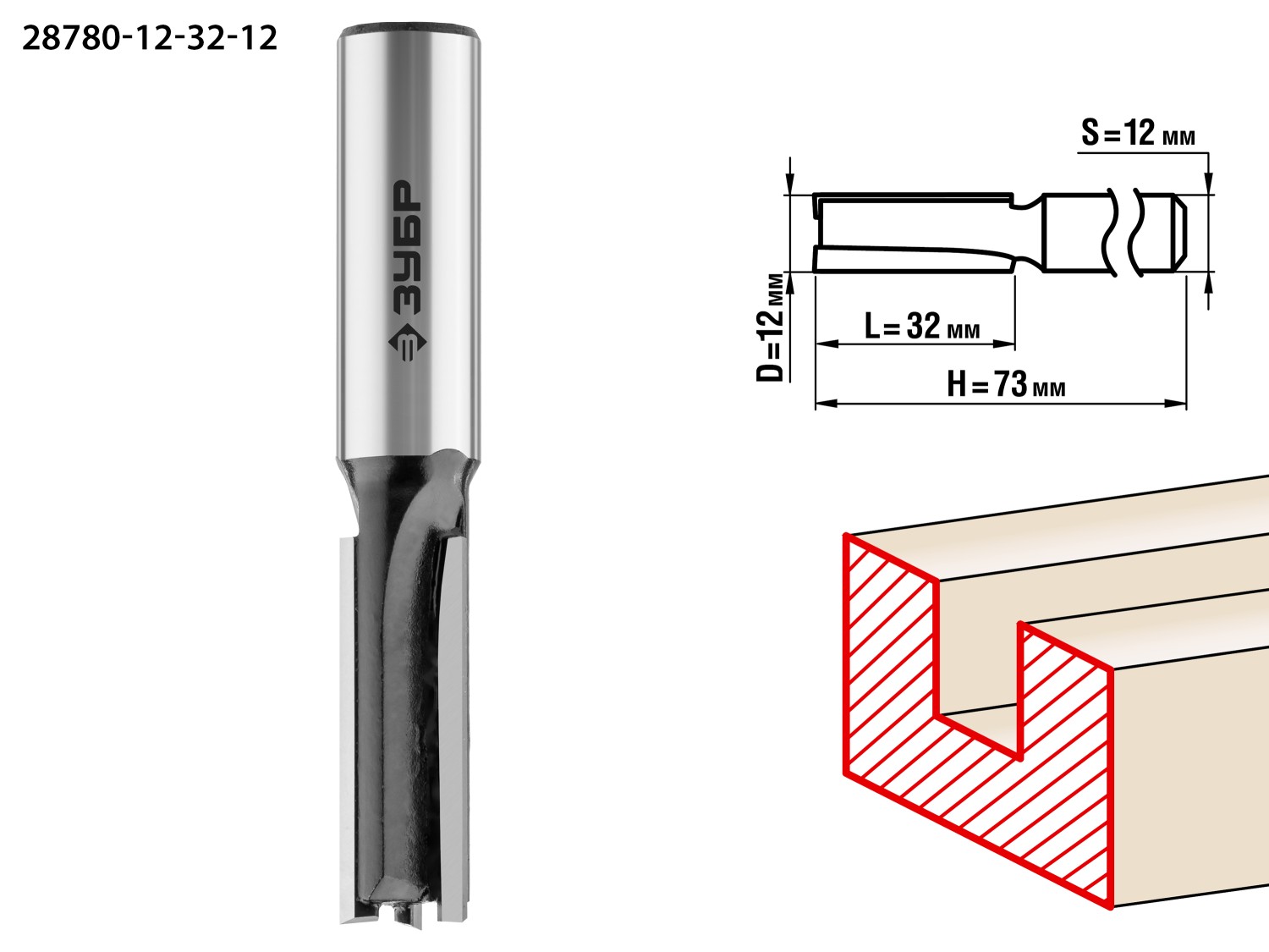 ЗУБР 12 x 32 мм, хвостовик 12 мм, фреза пазовая прямая, Профессионал (28780-12-32-12)