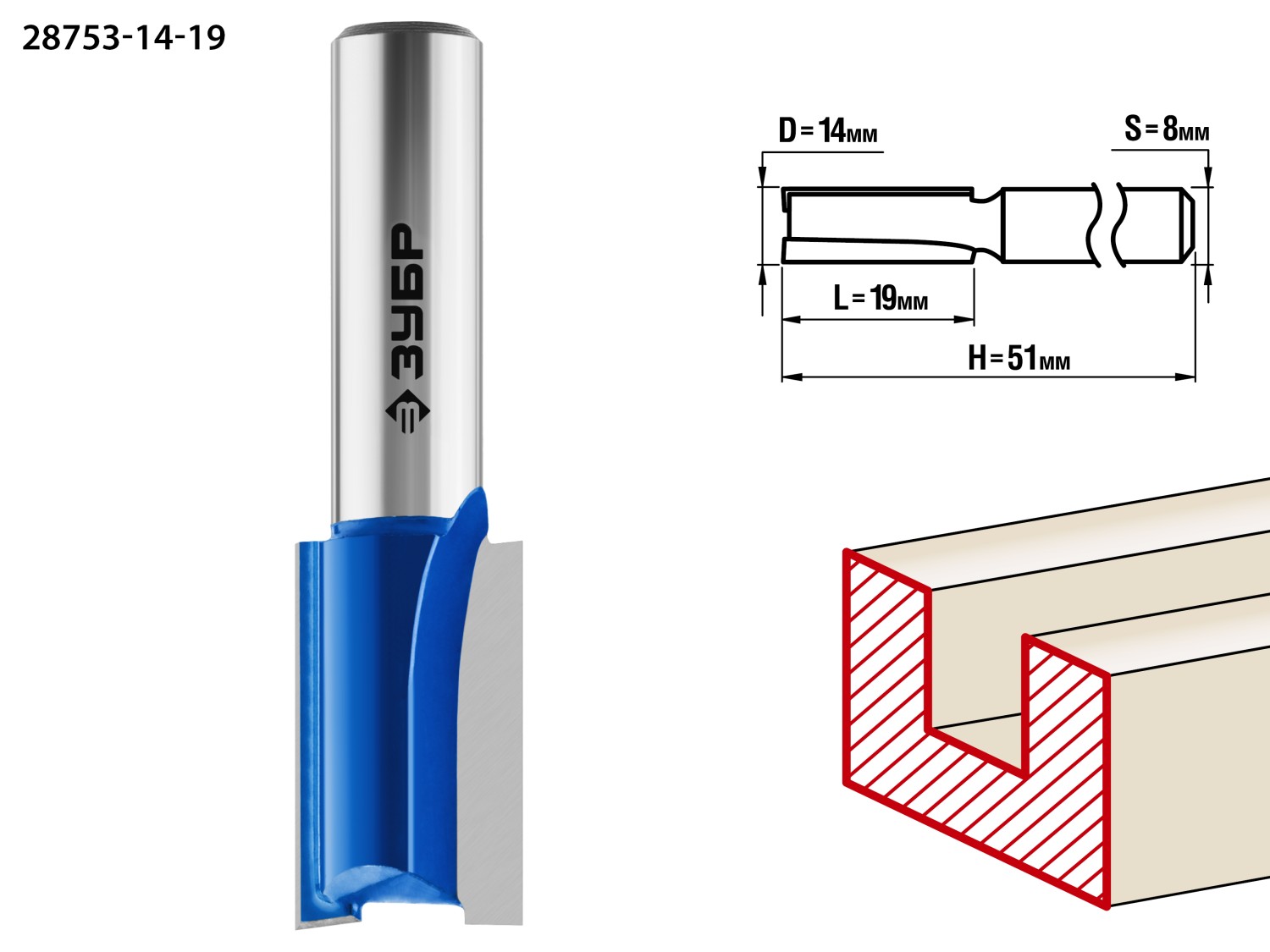 ЗУБР 14 x 19 мм, хвостовик 8 мм, фреза пазовая прямая, Профессионал (28753-14-19)