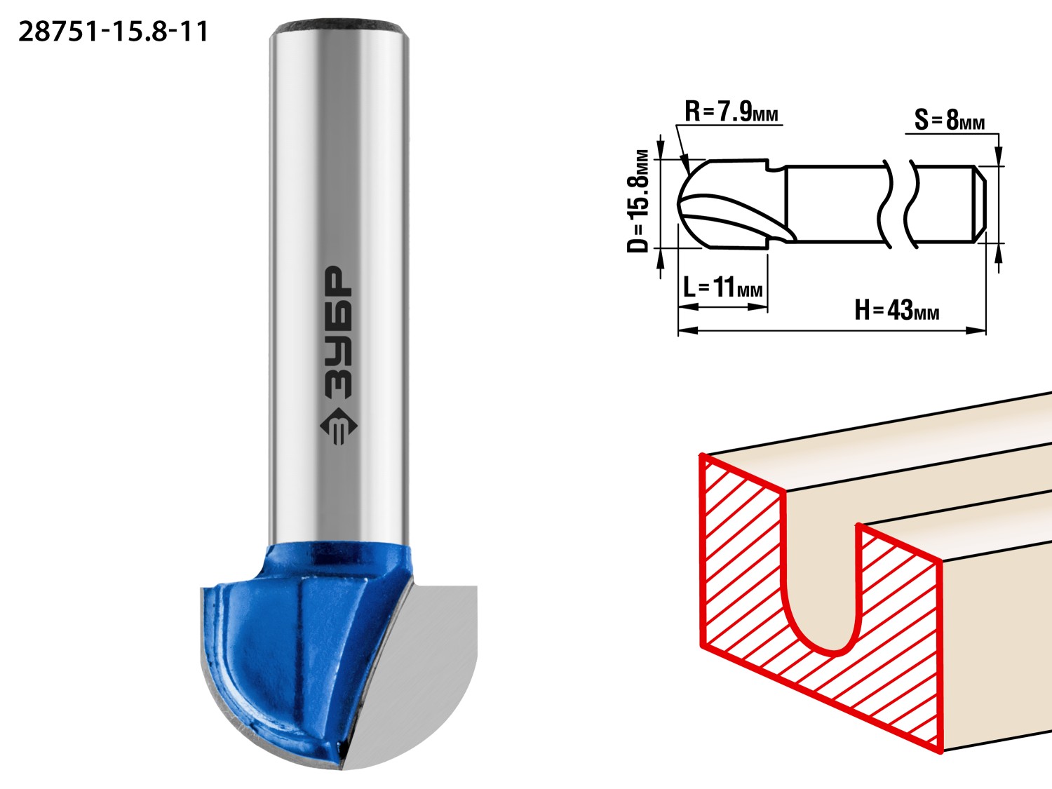 ЗУБР 15.8 x 11 мм, радиус 7.9 мм, фреза пазовая галтельная, Профессионал (28751-15.8-11)