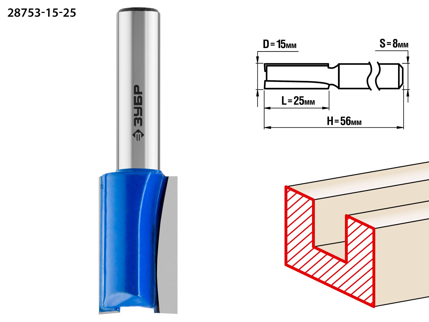 ЗУБР 15 x 25 мм, хвостовик 8 мм, фреза пазовая прямая, Профессионал (28753-15-25)