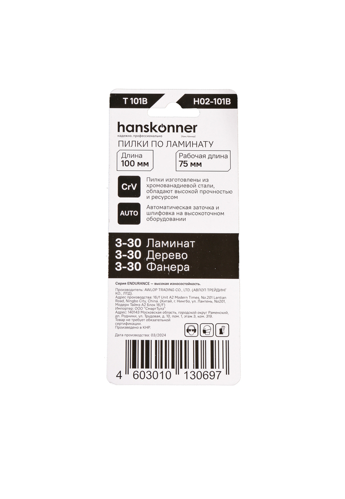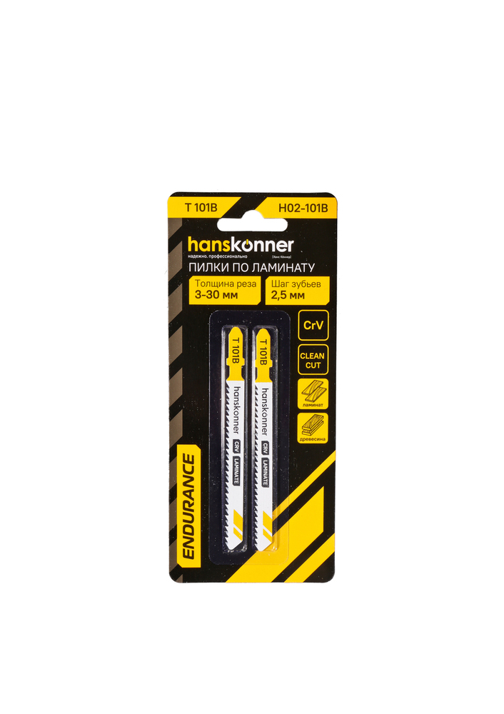 Пилки для лобзика по ламинату 2шт, T101B (дер,ДСП,фанера 3-30мм) Hanskonner