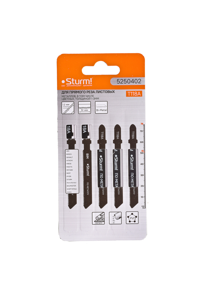 Пилки для лобзика по металлу T118A, 5 шт, 76х51мм, шаг зуба 1,2мм, прямолинейный чистый рез, BIM, Sturm!