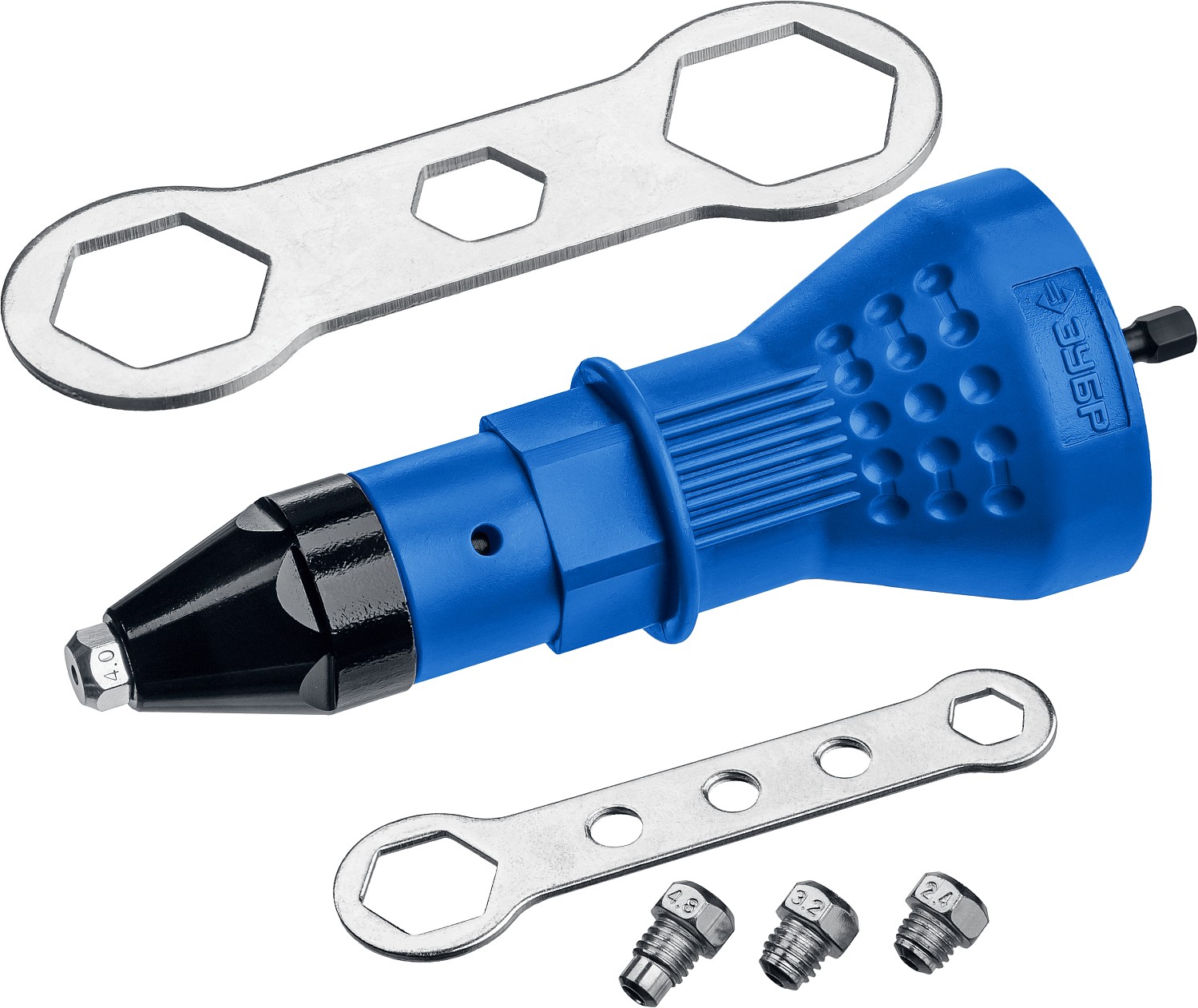 -Установка заклепок с помощью насадки и шуруповерта происходит намного быстрее и легче по сравнению с использованием классических заклепочников.;