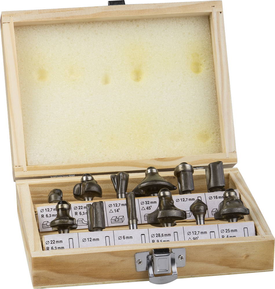 12 шт(пазовая( 6 мм), пазовая(12мм), Пазовая( 16мм), пазовая v-образная(12,7мм). Пазовая полукруглая( 12,7мм), ласточкин хвост 14гр(12,7мм), кромочная галтельная (22мм) - 2 шт, кромочная галтельная(28,6мм), кромочная галтельная(25мм), кромочная прямая с нижниим подшипником(12,7мм))