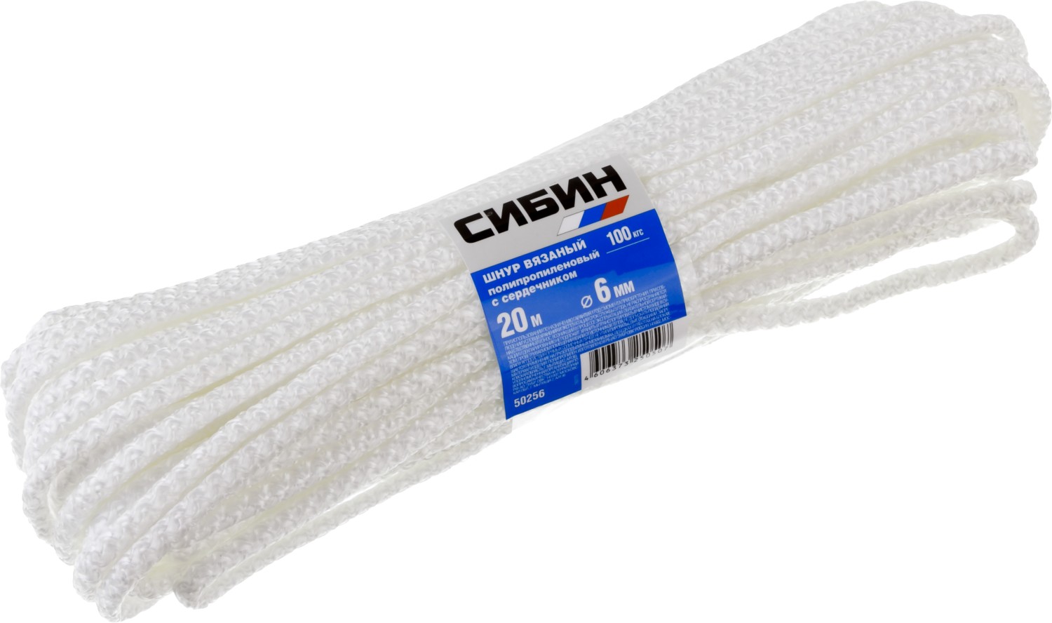 СИБИН 6 мм, 20 м, вязаный, с сердечником, белый, полипропиленовый шнур (50256)