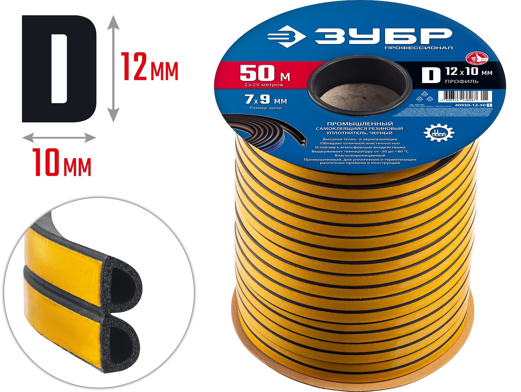 ЗУБР 50 м, D-профиль, размер 12 х 10 мм, черный, самоклеящийся промышленный резиновый уплотнитель, Профессионал (40950-12-50)