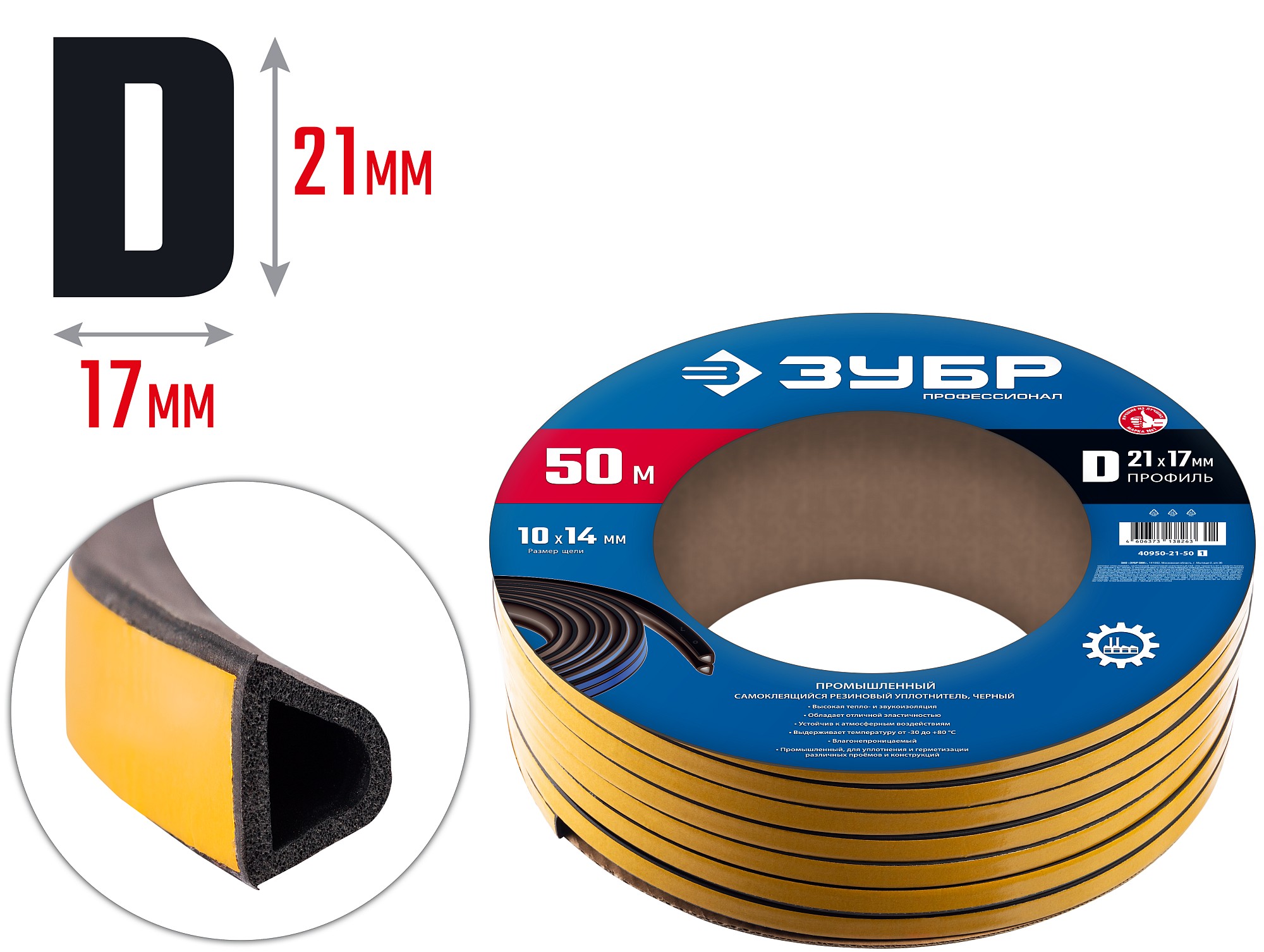 ЗУБР 50 м, D-профиль, размер 21 х 17 мм, черный, самоклеящийся промышленный резиновый уплотнитель, Профессионал (40950-21-50)