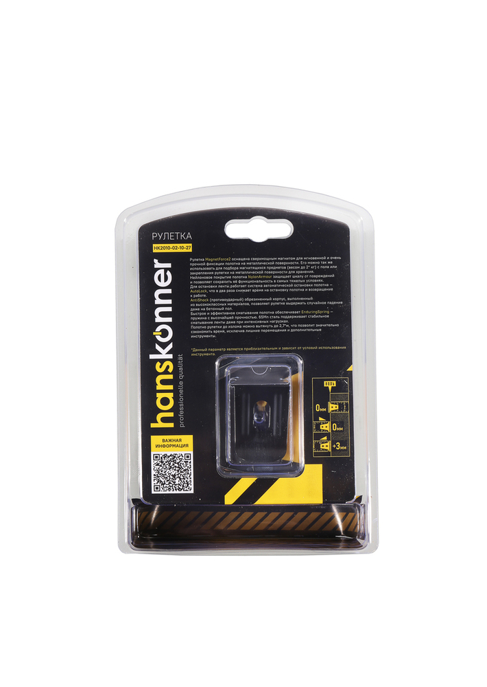 Рулетка 10x27мм, автостоп, двухстор., нейлон, супермощный магнит, Hanskonner