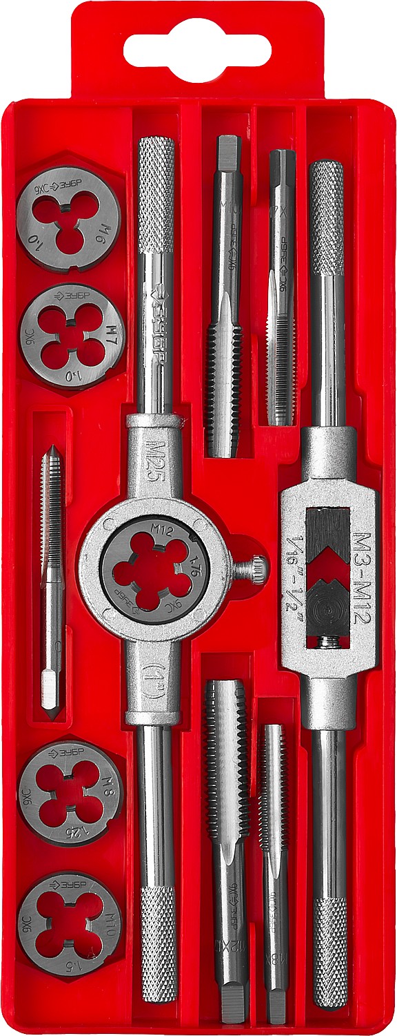 Комплектность из 12 предметов - Плашки (5шт) 6х1,0 7х1,0 8х1,25 10х1,5 12х1,75. Метчики (5шт) 6х1,0 7х1,0 8х1,25 10х1,5 12х1,75 Метчикодержатель М3-М12 -1шт. Плашкодержатель Д25(М3-М12) - 1шт.