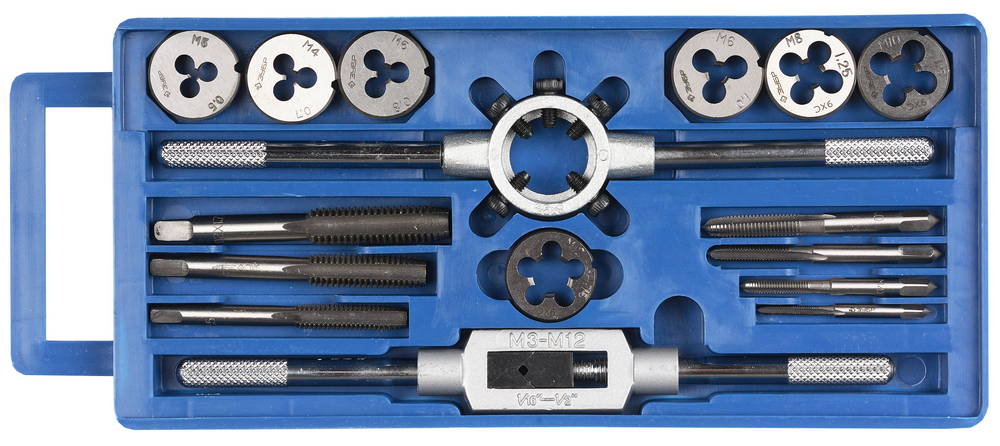 Комплектность из 16 предметов - Плашки (7шт) 3х0,5 4х0,7 5х0,8 6х1,0 8х1,25 10х1,5 12х1,75. Метчики (7шт) 3х0,5 4х0,7 5х0,8 6х1,0 8х1,25 10х1,5 12х1,75. Метчикодержатель М3-М12 -1шт. Плашкодержатель Д25(М3-М12) - 1шт.