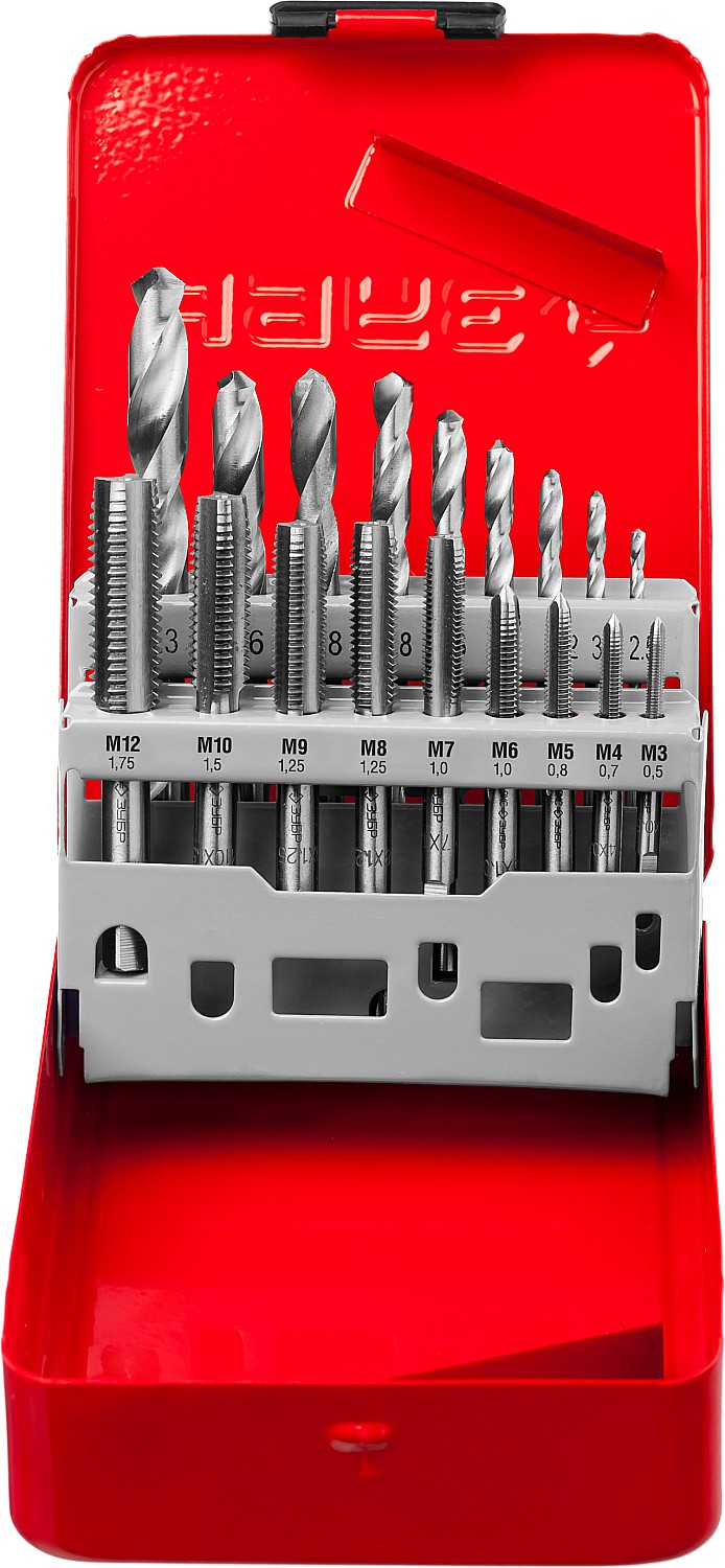 Комплектность из 18 предметов - метчики метрические (9шт) 3х0,5 4х0,7 5х0,8 6х1,0 7х1,0 8х1,25 9х1,25 10х1,5 12х1,75. Сверло под резьбу (9шт) 2,5 3,3 4,2 5,0 6,0 6,8 7,8 8,6 10,3.