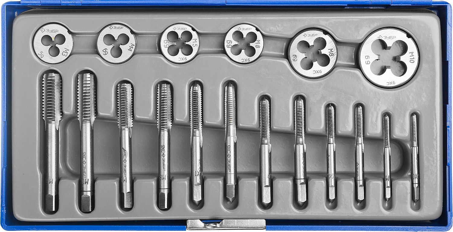 Комплектность из 18 предметов -Плашки (6шт) 3х0,5 4х0,7 5х0,8 6х1,0 8х1,25 10х1,5.. Метчики комплектные метрические (12шт) 3х0,5-2шт 4х0,7-2шт 5х0,8-2шт 6х1,0-2шт 8х1,25-2шт 10х1,5-2шт.