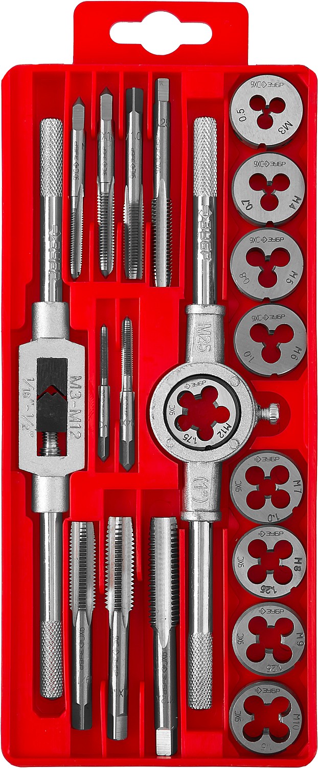 Комплектность из 20 предметов - Плашки (7шт) 3х0,5 4х0,7 5х0,8 6х1,0 7х1,0 8х1,25 9х1,25 10х1,5 12х1,75. Метчики (7шт) 3х0,5 4х0,7 5х0,8 6х1,0 7х1,0 8х1,25 9х1,25 10х1,5 12х1,75. Метчикодержатель М3-М12 -1 шт. Плашкодержатель Д25 (М3-М12) - 1шт.