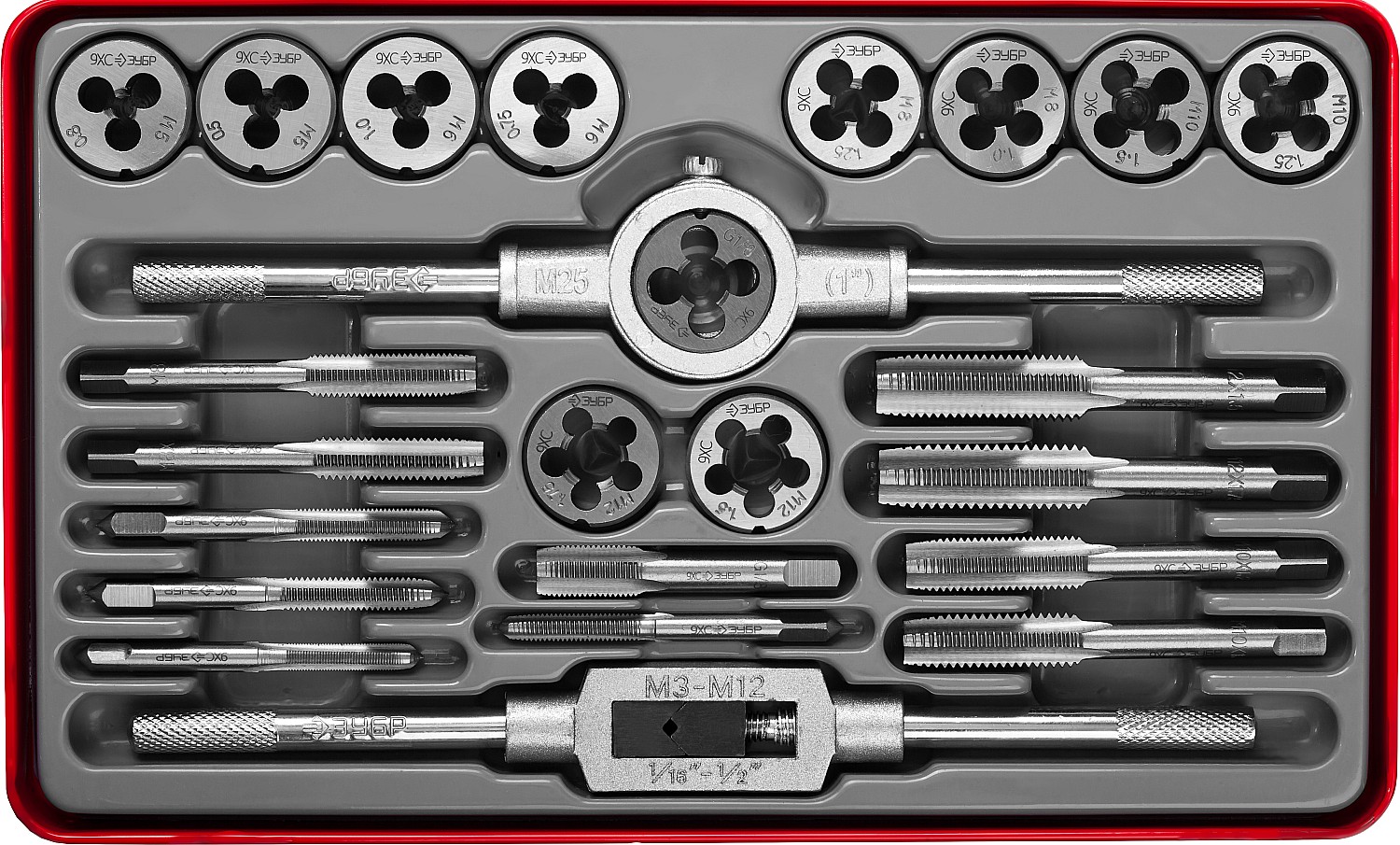 Комплектность из 24 предметов - метчики метрические -(10шт) 5х0,8 5х0,5 6х1,0 6х0,75 8х1,25 8х1,0 10х1,5 10х1,25 12х1,75 12х1,5 Метчик трубный (1шт) 1/8-27. Плашки метрические (10шт) 5х0,8 5х0,5 6х1,0 6х0,75 8х1,25 8х1,0 10х1,5 10х1,25 12х1,75 12х1,5 плашка трубная 1 шт 1/8-27. Метчикодержатель М5-М12 -1шт. Плашкодержатель Д25 - 1шт.