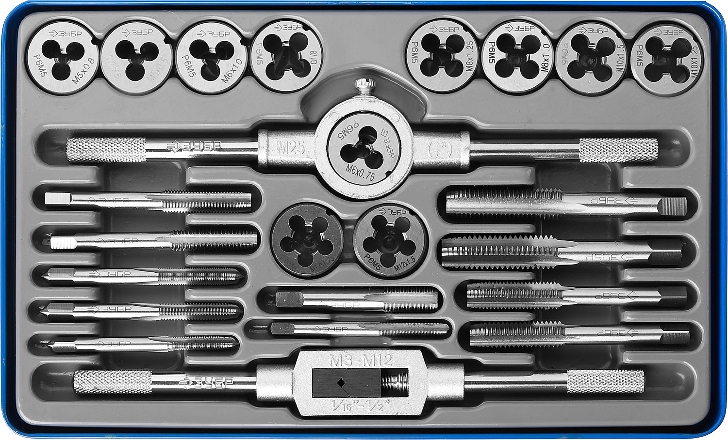24 предмета: метчики метрические(10шт): 5х0,8, 5х0,5, 6х1,0, 6х0,75, 8х1,25, 8х1,0, 10х1,5, 10х1,25, 12х1,75, 12х1,5, Метчик трубный(1шт) - 1/8-27. Плашки метрические(10шт)5х0,8, 5х0,9, 6х1,0, 6х0,75, 8х1,25, 8х1,0, 10х1,5, 10х1,25, 12х1,75, 12х1,5, Плашка трубная (1шт) - 1/8-27. Метчикодержатель Д25мм M3-M12, Плашкодержатель M5-M12.
