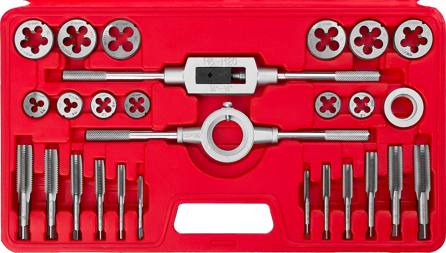 Комплектность из 27 предметов - Плашки (12шт) 5х0,8 6х1,0 8х1,0 8х1,25 10х1,0 10х1,5 12хх1,25 12х1,75 14х2,0 14х1,5 16х2,0 16х1,5. Метчики (12шт) 5х0,8 6х1,0 8х1,0 8х1,25 10х1,0 10х1,5 12хх1,25 12х1,75 14х2,0 14х1,5 16х2,0 16х1,5. Метчикодержатель М5-М12 -1. Плашкодержатель Д38 - 1шт. Сменная втулка для плашек Д25-1шт.
