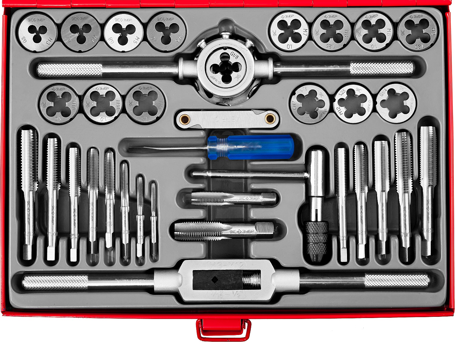 35 предметов: плашки метрические ( 13 шт) - 3х0,5, 4х0,7, 5х0,8, 6х1,0, 7х1,0, 8х1,25, 8х1,0, 9х1,25, 10х1,5, 10х1,0, 11х1,5, 12х1,75, 12х1,25, Плашки трубные(2 шт) 1/8-28, 1/4-19. Метчики метрические (13 шт) 3х0,5, 4х0,7, 5х0,8, 6х1,0, 7х1,0, 8х1,25, 8х1,0, 9х1,25, 10х1,5, 10х1,0, 11х1,5, 12х1,75, 12х1,25, Метчики трубные (2шт) -1/8-28, 1/4-19. Метчикодержатель M3-M12, Метчикодержатель Т-образный M6-M12, плашкодержатель Д25мм M3-M12, резьбомер, отвертка-1шт.