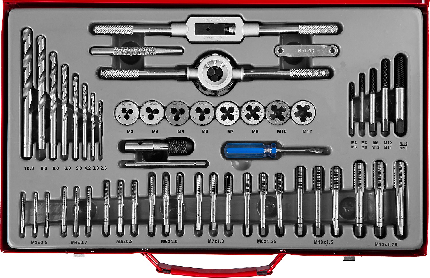 Комплексность из 52 предметов, плашки 8шт. 3х0,5 4х0,7 5х0,8 6х1,0 7х1,0 8х1,25 10х1,5 12х1,75. Метчики комплектные №1,2,3 24шт. 3х0,5 4х0,7 5х0,8 6х1,0 7х1,0 8х1,25 10х1,5 12х1,75. Сверла под резьбу - 2,5- 3,3-4,2-5,0-6,0-7,8-8,6-10,3. Экстракторы 5шт. Метчикодержатель М3-М12-2шт., плашкодержатель Д25(М3-М12)-1шт., отвертка-1шт., резьбомер-1шт., кернер-1шт.