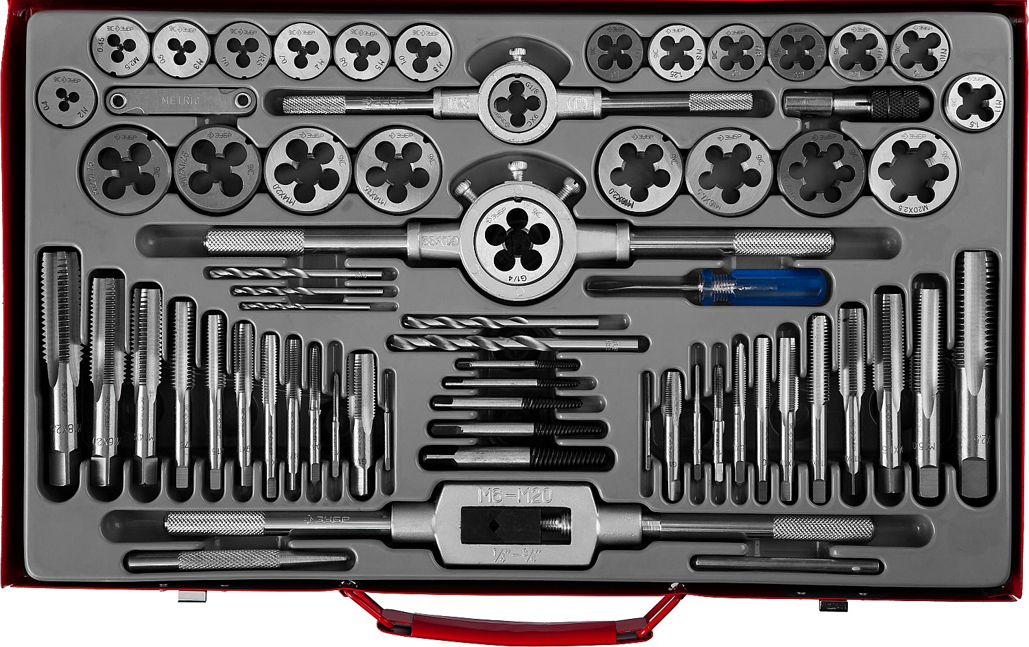 65 предметов, плашки метрические(22 шт): 2х0,4, 2,5х0,45, 3х0,5,3,5х0,6, 4х0,7, 5х0,8, 6х1,0, 7х1,0, 8х1,25, 8х1,0, 9х1,25, 10х1,5, 10х1,0, 11х1,5, 12х1,75, 12х1,25, 14х2,0, 14х1,5, 16х2,0, 16х1,5, 18х2,5, 20х2,5, плашки трубные (2шт): 1/8-28, 1/4-19. Метчики метрические(22шт) 2х0,4, 2,5х0,45, 3х0,5, 3х0,6, 4х0,7,5х0,8, 6х1,0, 7х1,0, 8х1,25, 8х1,0, 9х1,25, 10х1,5, 10х1,0, 11х1,5, 12х1,75, 12х1,25, 14х2,0, 14х1,5, 16х2,0, 16х1,5, 18х2,5, 20х2,5, Метчики трубные (2шт) 1/8-28, 1/4-19. Сверла под резьбу (5шт)2,5- 3,3-4,2-5,0-6,8. Экстракторы(5шт)№1,2,3,4,5. Метчикодержатель М6-М20, Метчикодержатель Т-образный М2-М6, плашкодержатель Д38мм(М11-М20), плашкодержатель Д25мм(М2-М10), отвертка-1шт., резьбомер-1шт., кернер-1шт.