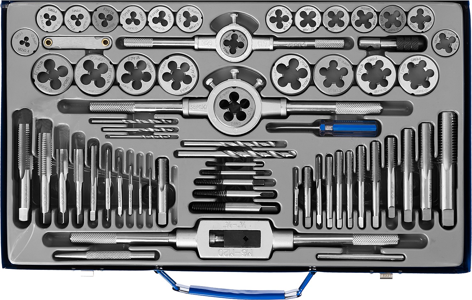 65 предметов, плашки метрические(22 шт): 2х0,4, 2,5х0,45, 3х0,5,3,5х0,6, 4х0,7, 5х0,8, 6х1,0, 7х1,0, 8х1,25, 8х1,0, 9х1,25, 10х1,5, 10х1,0, 11х1,5, 12х1,75, 12х1,25, 14х2,0, 14х1,5, 16х2,0, 16х1,5, 18х2,5, 20х2,5, плашки трубные (2шт): 1/8-28, 1/4-19. Метчики метрические(22шт) 2х0,4, 2,5х0,45, 3х0,5, 3х0,6, 4х0,7,5х0,8, 6х1,0, 7х1,0, 8х1,25, 8х1,0, 9х1,25, 10х1,5, 10х1,0, 11х1,5, 12х1,75, 12х1,25, 14х2,0, 14х1,5, 16х2,0, 16х1,5, 18х2,5, 20х2,5, Метчики трубные (2шт) 1/8-28, 1/4-19. Сверла под резьбу (5шт)2,5- 3,3-4,2-5,0-6,8. Экстракторы(5шт)№1,2,3,4,5. Метчикодержатель М6-М20, Метчикодержатель Т-образный М2-М6, плашкодержатель Д38мм(М11-М20), плашкодержатель Д25мм(М2-М10) ., отвертка-1шт., резьбомер-1шт., кернер-1шт.