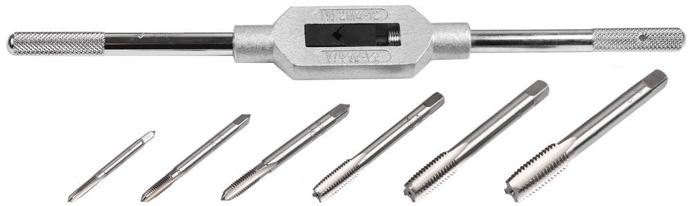 Комплектность из 8 предметов - Метчиков (7шт) 3х0,5 4х0,7 5х0,8 6х1,0 8х1,25 10х1,5 12х1,75. Метчикодержатель М3-М12 -1шт.